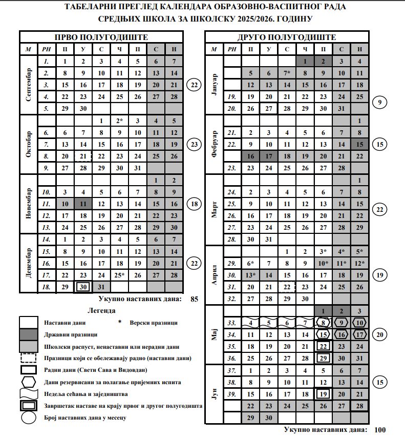 Табеларни преглед календара образовно-васпитног рада средњих школа са седиштем на територији Републике Србије за школску 2025/2026 годину. Календар можете преузети кликом на ЛИНК